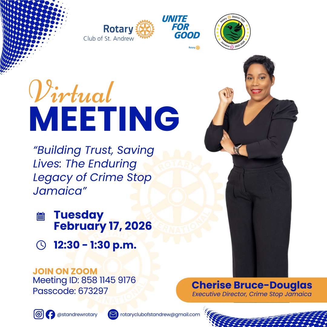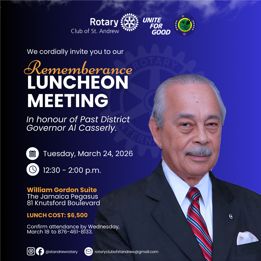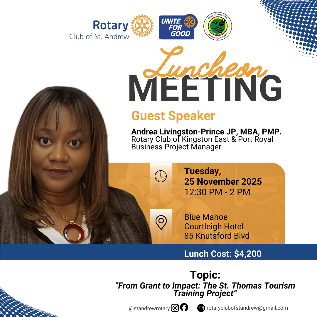 If the support given in preparing for this installation banquet is anything to go by, then I believe that this will be a phenomenal year. My all-female committee, comprised of an excellent mix of age, experience and personalities, made this event happen with their input in many ways. Thanks to PAG’s Judy and Marie, PP’s Ammesha and Jemelia and Rotarians Minna and Sherika. Not to be forgotten are my generous sponsors, who I will classify as the fuel which kept the Engine going. They are Sterling Asset Management, Airports Authority, Hylton & Hylton, Baker Tilly, Jakes, Grand Palladium Hotel, Pegasus Hotel and members of the Rotary Club of St. Andrew.